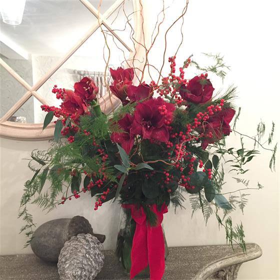 A generous glass vase filled with the seasons best foliage of spruce and eucalyptus, with red ilex berries and our festive favorite bloom Amaryllis. Amaryllis will be delivered in bud but are one of favorite flowers for the festive season its gorgeous full blooms are long last and ideal for a dramatic display. This display will rest perfectly on a sideboard or occasional table. Vase in included. your gift is finished with a festive ribbon and hand signed card message.