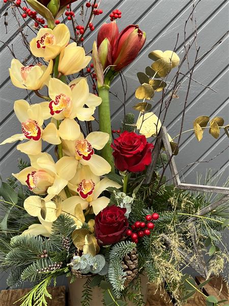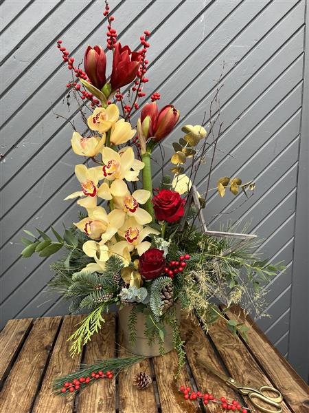 Handcrafted by our expert florists, this tall and impactful arrangement is filled with exquisite festive blooms and lush seasonal foliage. It features dramatic red amaryllis, elegant gold and red-flecked cymbidium orchids, and deep red roses, complemented by pine cones, fragrant fir, and bright red berries.