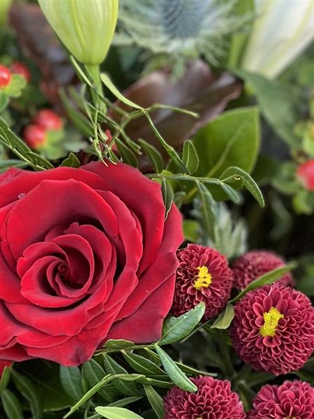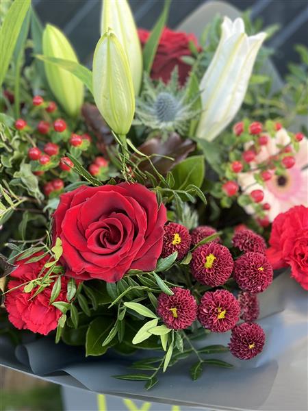 This wonderful seasonal hand tied bouquet expertly designed by our florists to capture the spirit of an Irish Christmas using the freshest flowers available. The bouquet features a stunning, rich seasonal mix, including deep crimson roses, fragrant white oriental lilies, vibrant gerbera daisies, and lush red carnations. Unique textural accents like striking blue Thistle and festive red berries are nestled within the mixed winter foliage.