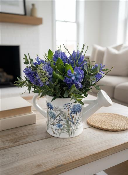 Featuring deeply fragrant, seasonal blue hyacinths nestled among fresh woodland greenery, this arrangement is presented in a stunning, high-quality ceramic watering can with a classic blue-and-white botanical motif. One of the greatest benefits of this gift is that it arrives ready to enjoy immediately. There is no need for a vase or any arranging on Mum's part, making it perfect for display on a windowsill, mantle, or bedside table the moment it is delivered.