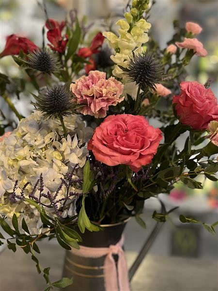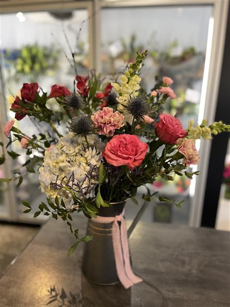 Celebrate Mother’s Day with a soulful blend of rustic charm and seasonal elegance from our exclusive Blooming Traditions collection. This hand-crafted arrangement features a vibrant tapestry of premium roses, pillowy hydrangeas, and delicate Alstroemeria, beautifully accented with architectural snapdragons and wild-textured thistles. Nestled in a zinc keepsake jug and finished with a soft ribbon, it is a nostalgic tribute designed to honor the women who nurture us most.